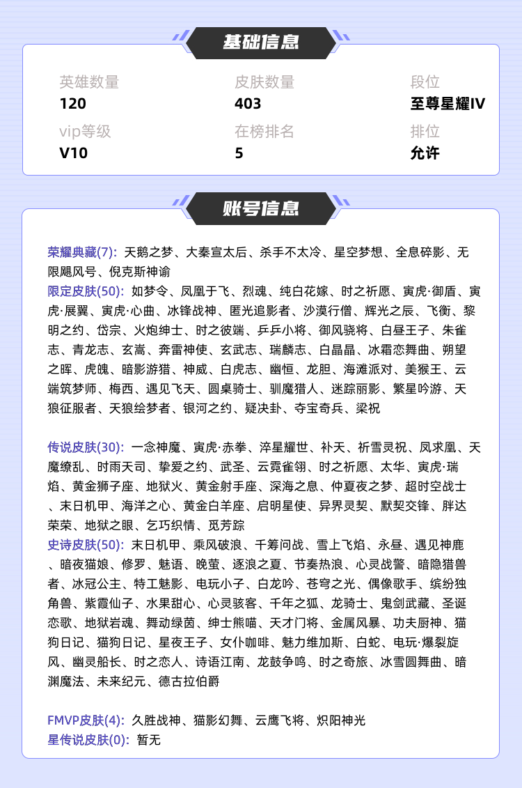 本游戏账号: V10用户,基础段位:至尊星耀IV,英雄多,皮肤多。典藏皮肤7个,感受典藏皮肤带来的优质体验快感,FMVP皮肤4个,尽情享受FMVP皮肤带来的主角光环, 私人所属英雄皮肤有:孙悟空 全息碎影||孙尚香 杀手不太冷||小乔 天鹅之梦||夏侯惇 无限飓风号||鲁班七号 星空梦想||芈月 大秦宣太后||武则天 倪克斯神谕裴擒虎 寅虎·赤拳||孙悟空 地狱火||马可波罗 深海之息||吕布 天魔缭乱||孙尚香 异界灵契||公孙离 祈雪灵祝||鲁班七号 寅虎·瑞焰||关羽 武圣||后羿 黄金射手座||虞姬 启明星使||虞姬 云霓雀翎||达摩 黄金狮子座||诸葛亮 时雨天司||狄仁杰 超时空战士||孙策 挚爱之约||孙策 末日机甲||女娲 补天||宫本武藏 地狱之眼||貂蝉 仲夏夜之梦||李白 凤求凰||武则天 海洋之心||伽罗 太华||瑶 时之祈愿||兰陵王 默契交锋||李信 一念神魔||张良 黄金白羊座||王昭君 乞巧织情||艾琳 觅芳踪||赵云 淬星耀世||梦奇 胖达荣荣,