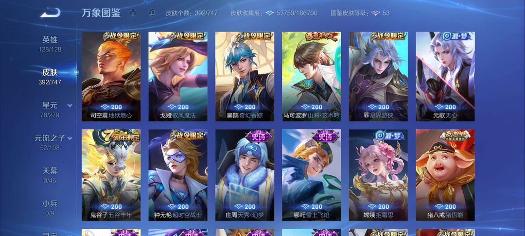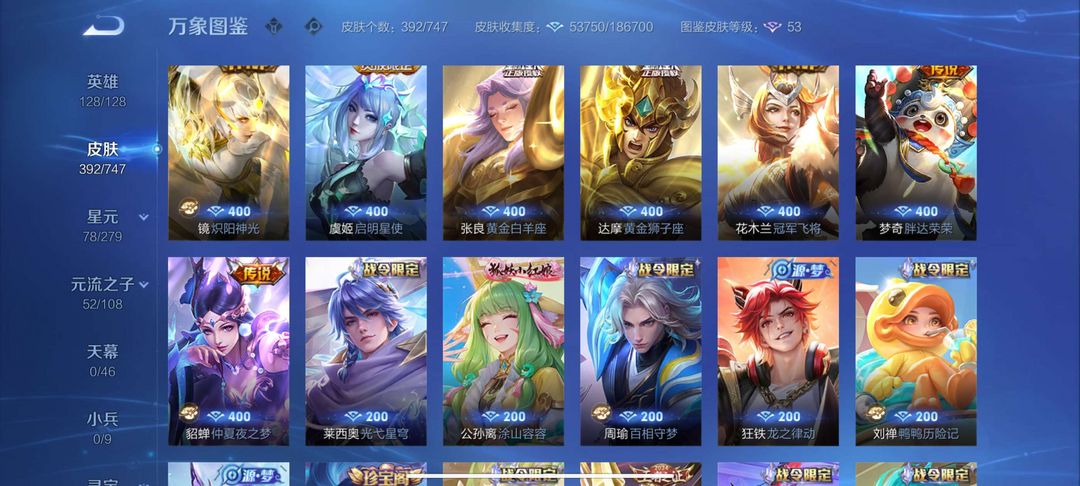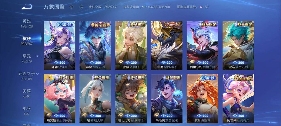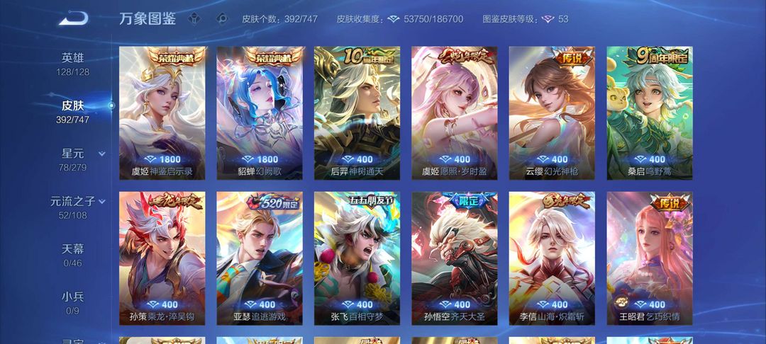 稀有皮肤10个以上,限定10个以上,荣耀典藏3个